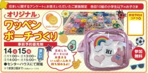 2025年9月14日、15日に朝日ハウジングプラザ学研都市ひびきのにて「ワッペンポーチづくり」を開催しました。選んだワッペンをポーチに貼り付けオリジナルのポーチを作り、最後にお菓子を入れる体験をしました。両日ともに満員御礼でした。